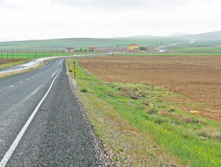 6:30 am and the alarm goes. It's a light drizzle outside, so I guess I'm going to ride. The next destination, Cappadocia is supposed to be some kind of "backpacker Mecca" so I don't want to waste one of my rest-days here in Aksaray. Repacking my panniers to assure that everything stays dry takes time, and I'm finally got on the road at 9:00 am. I have a smooth exit from town and the ride east is nice - rolling hills. Although the drizzle has stopped, the ride is wet since the bike tires are picking up every drop of moisture, but this rain-riding is a novelty and I'm fine with the situation.